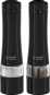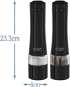 Salz- und Pfeffermühle, elegant, kombiniert zeitgemäßen Stil mit Komfort. Die Mühlen aus schwarzem Edelstahl setzen überall ein Zeichen, in der Küche wie auf dem Esstisch. Mit hochwertigem Keramikmahlwerk, Beleuchtung während des Mahlvorgangs und Ein-Hand-Bedientaste. Mahlt Salz, Pfeffer und Gewürze fein bis grob je nach Vorliebe. Batteriebetrieben (4 x AA Batterien pro Mühle, nicht im Lieferumfang enthalten).